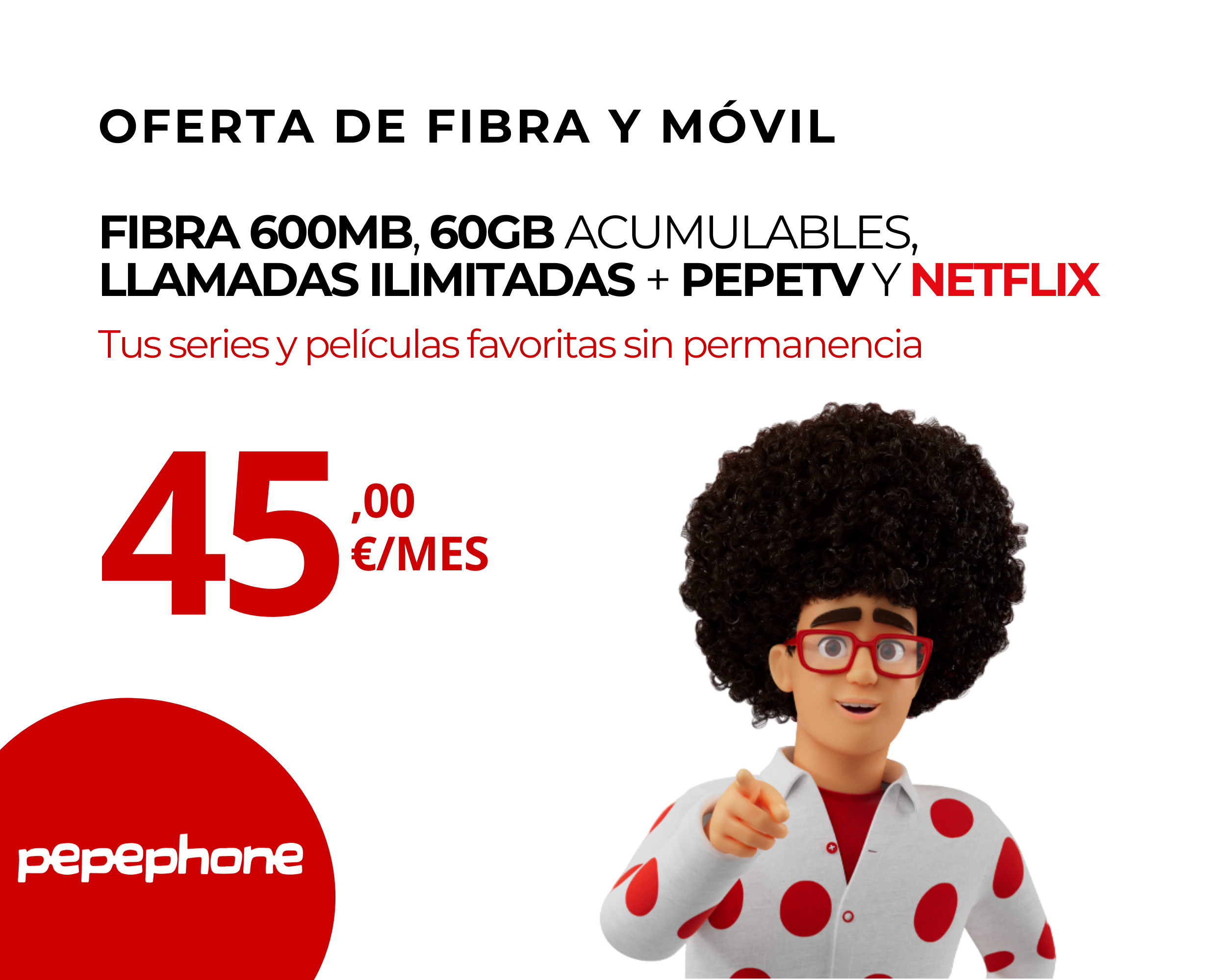 Orange Fibra 600 Mb + línea móvil con llamadas ilimitadas y 60 GB a máxima velocidad 5G+Tarifas Fibra y Móvil,Orange¡Lo quiero! Pepephone tarifa Fibra, Móvil, Pepe TV y NetflixTarifas Fibra y Móvil,Pepephone¡Lo quiero! MásMóvil Oferta de fibra y móvil 5GTarifas Fibra y Móvil,MásMóvil¡Lo quiero! Vodafone Fibra 600MbpsVodafone,Tarifas Fibra y Móvil¡Lo quiero! Orange Tarifa Fibra 600 Mb y TVOrange,Tarifa Fibra + TV¡Lo quiero! Yoigo Fibra 600 Mb + GB infinitos + NETFLIX + DISNEY + MAXTarifas Fibra y Móvil,Yoigo¡Lo quiero! Pepephone tarifa Fibra y MóvilTarifas Fibra y Móvil,Pepephone¡Lo quiero! Vodafone Fibra 600Mb + 2 líneas móviles 25GBVodafone,Tarifas Fibra y Móvil¡Lo quiero! Vodafone Fibra 600Mb + 1 línea ilimitadaVodafone,Tarifas Móvil,Fibra¡Lo quiero!