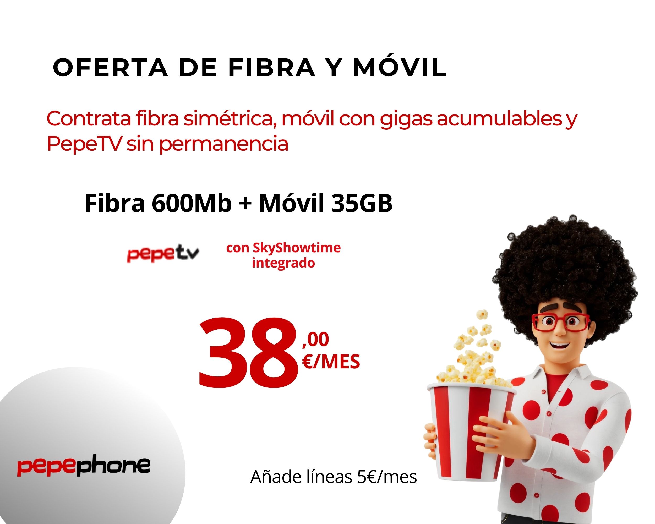Fibra 600 Mb + Móvil 35 GB por 38 €/mes con Pepephone: sin permanencia ni subidas de precio. Incluye llamadas ilimitadas, PepeTV con SkyShowtime, cobertura 5G, roaming en la UE sin coste y líneas adicionales por 5 €/mes. Todos los precios incluyen IVA.
