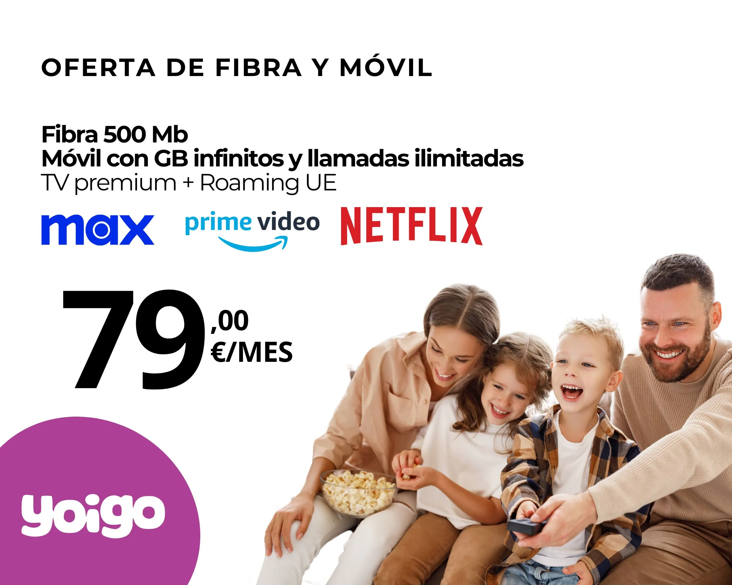 Yoigo Fibra 500 Mb + GB Infinitos + Netflix + Prime + Max + TV premium - TarifasWeb